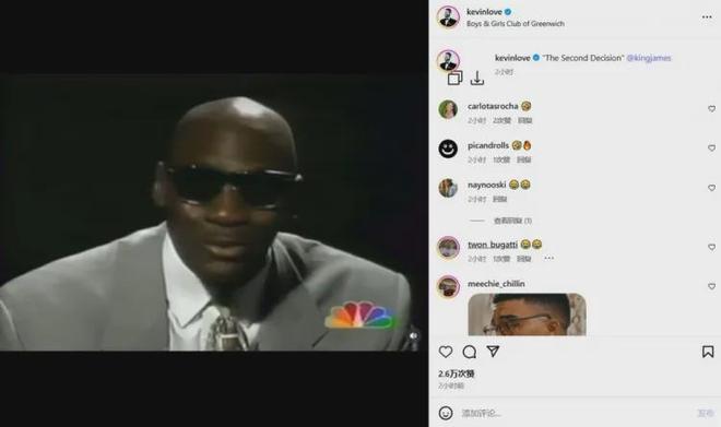 作为詹姆斯的多年好友和前队友,每次碰面都要大力拥抱詹姆斯的乐福则拿出一张乔丹于2003年在奇才举行退役仪式的视频,开玩笑写了“决定二”。